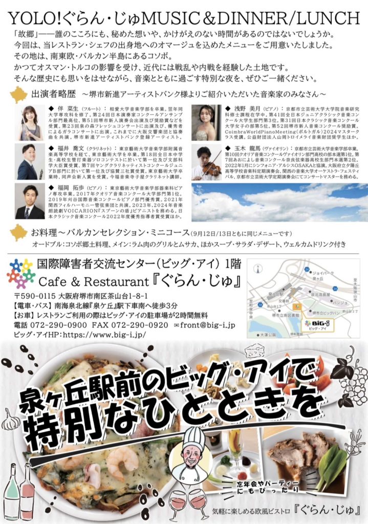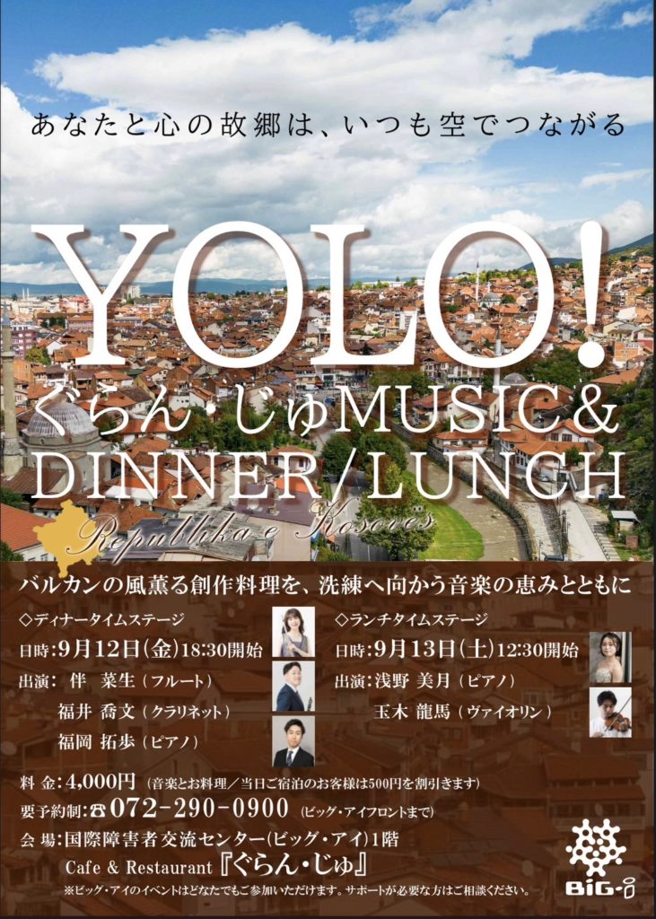 9/12(金) YOLO! ぐらん・じゅMUSIC & DINNER 拓歩(弟) 出演情報 Twitter Facebook はてブ Pocket LINE コピー 2025.12.06 YOLO!ぐらん・じゅMUSIC&DINNER/LUNCH ~あなたと心の故郷は、いつも空でつながる~ | お知らせ | 国際障害者交流センター(ビッグ・アイ)国際障害者交流センター(ビッグ・アイ)は、障がいのある方も、ない方も、すべての人にご利用いただける施設です。障がい者が主役の芸術・文化・国際交流活動の機会を創出し、障がい者の社会参加促進をめざします。施設内には、多目的ホールや研修室、宿泊室、レストランを備えています。